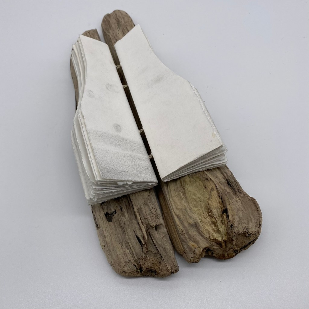 The shape and curve of this driftwood made binding and preparing signatures interesting . Drawings are chopped up sketches from school.