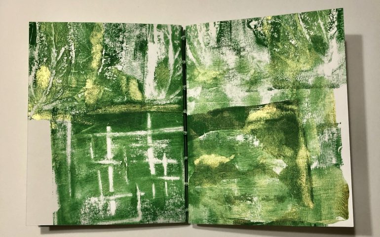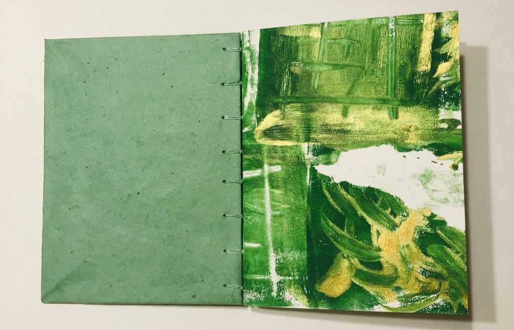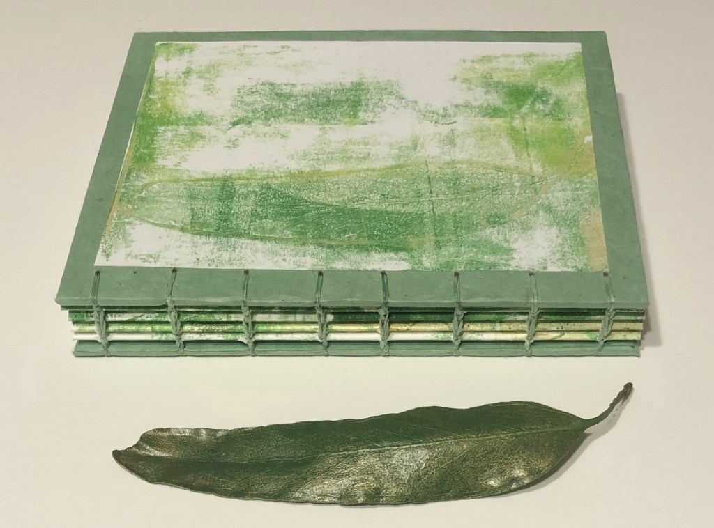 Me printing with eucalyptus leaves leftover from a paper ecodye project. The resulting “painted” leaves were so intriguing I preserved a couple of them with modge podge before they dried out and cracked. Loved how two separate signature pages created new layouts as if they were always whole.