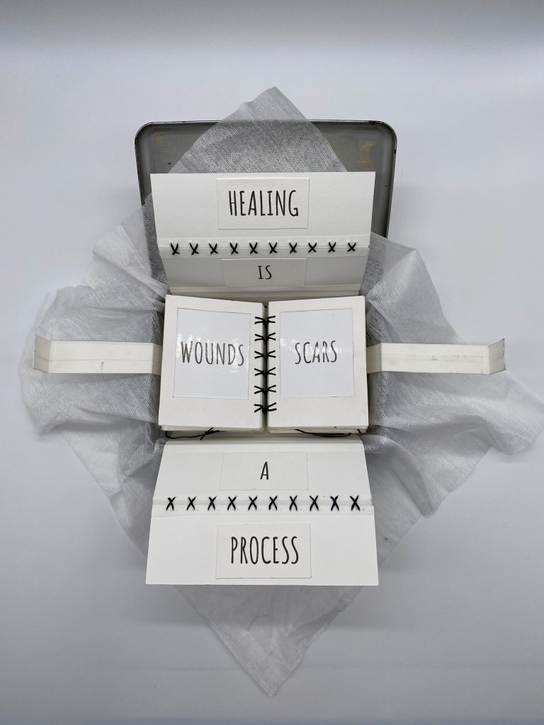 A duo accordion book. The book(s)’ pages are “Polaroid” photos of an over year long healing process. Bandaged and held together with book tape and 98 stitches, the book(s) are wrapped in the words “HEALING IS A PROCESS”. The whole thing is encased in an old Johnson & Johnson bandage tin.