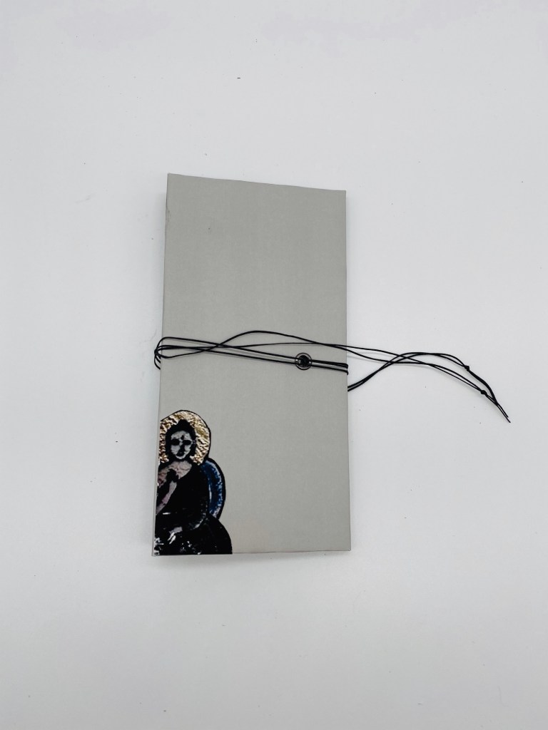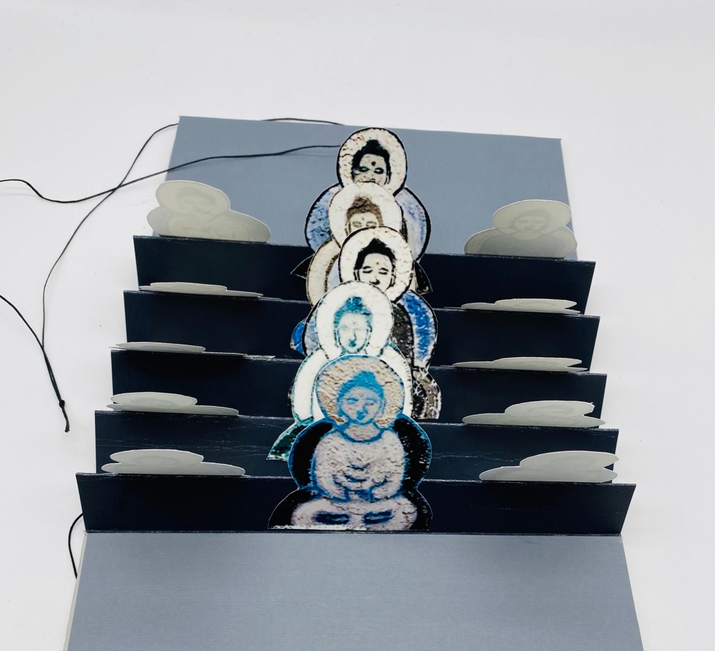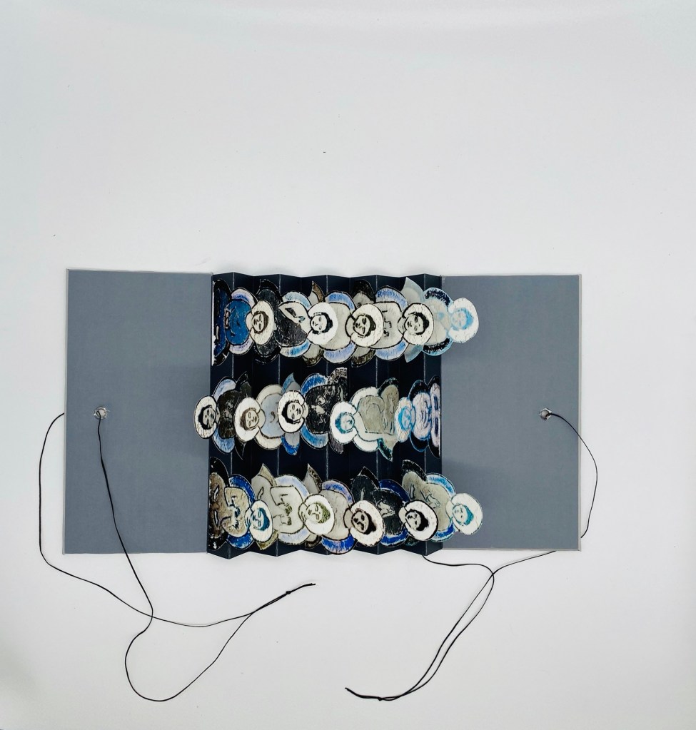 A flag book of meditating ladies. This was made from a print a photographer friend, Kathy Gerber gave me. It took me a while to figure the best way around the original print. I wanted to save as much of the ladies as possible with whatever I did and a flag book was the best option.