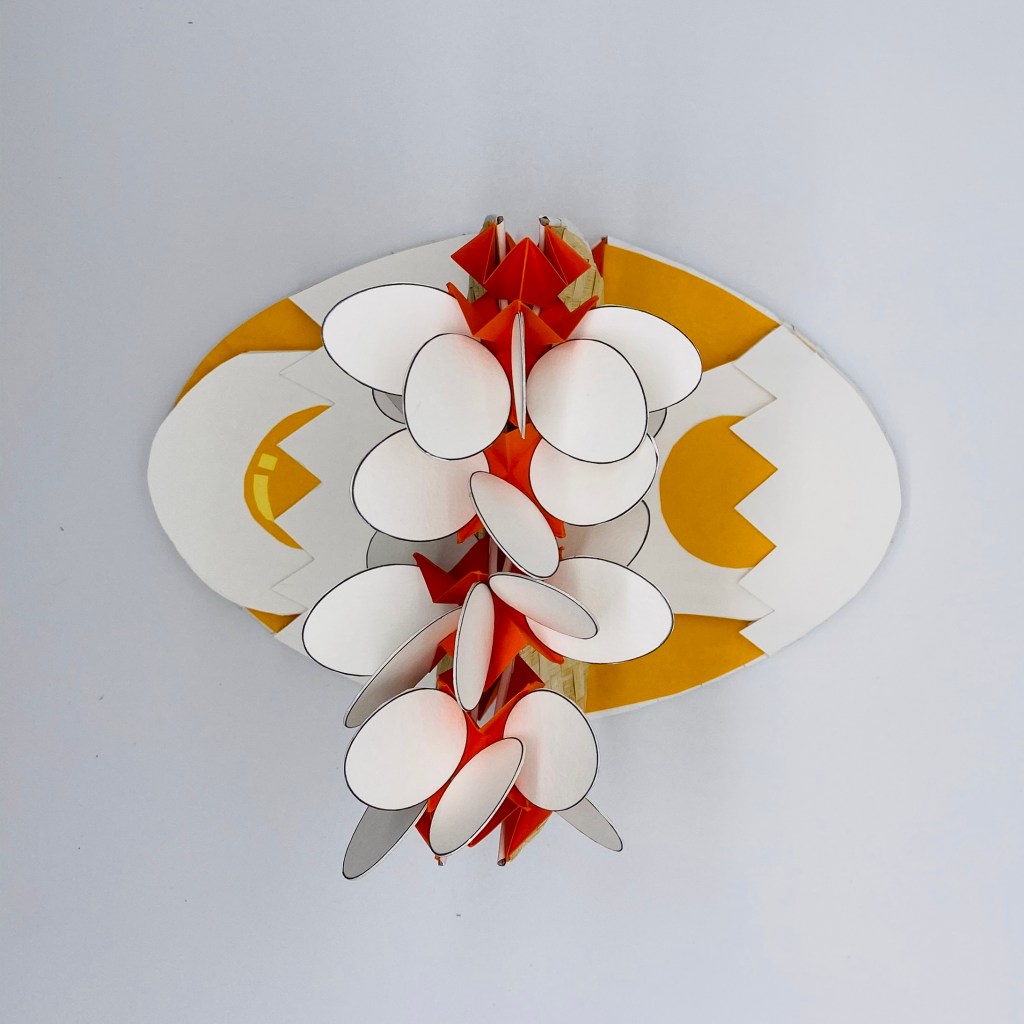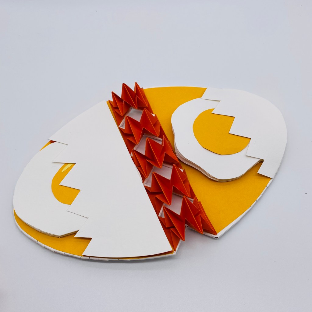 Inspired by my affinity for Gudetama a 1, 2, 3, 4 book project in a single shell. A “basket” off eggs flag book on the bottom half, and a couple of just bigger than mini sunny side up books on the top. This evolved as it was being made. I had no idea what the end result was going to be who I began.Don’t count your books before they’ve hatched.