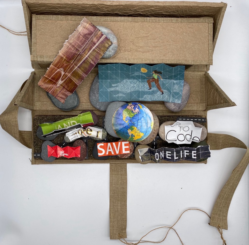 A box of “rock chocolates”… you never know what you’re gonna get. A bit 3D vision board. A collection of mini life mountains that need climbing. Originally the magazine pieces were just supposed to be place holders for when inspiration hit me later. But they ended up being a theme for what I was processing at the time so they stayed.