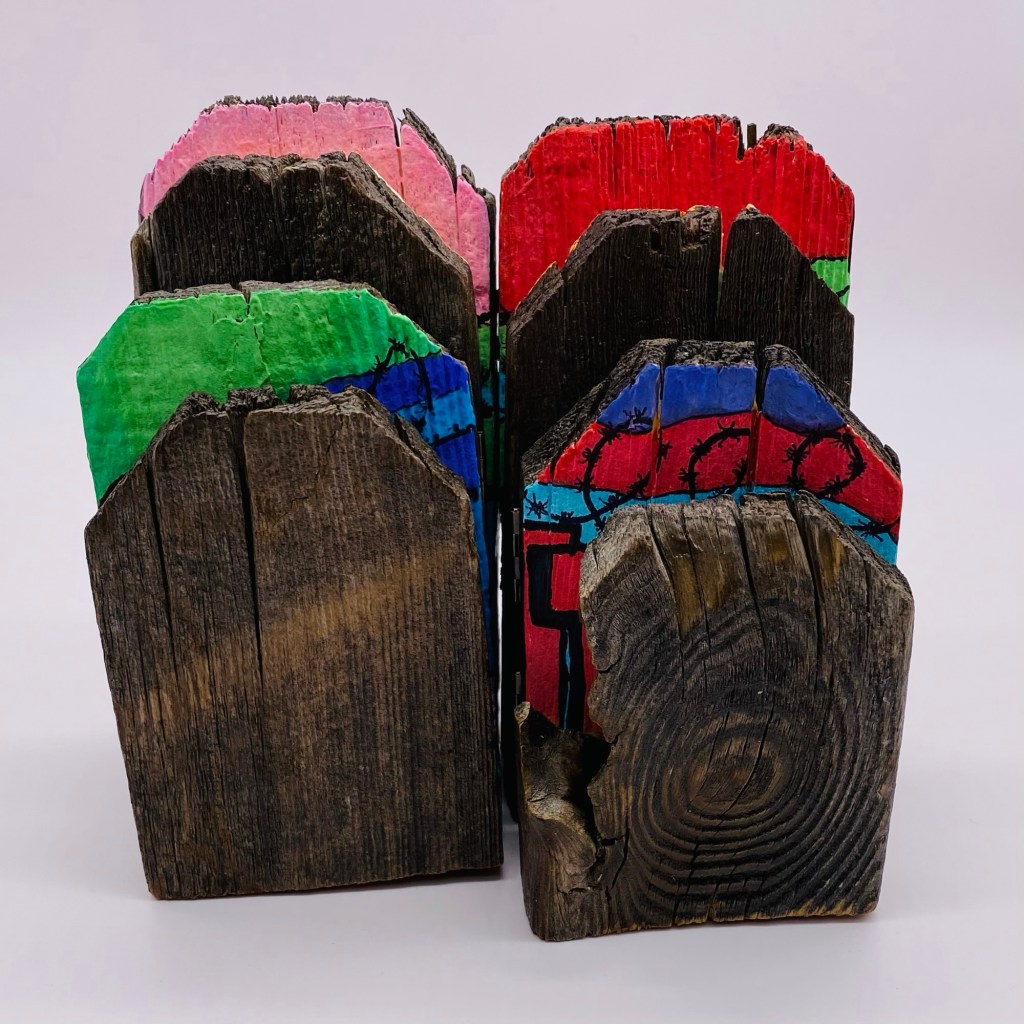 This was quite a bit of fun to make. A concertina putting together a collection of dog eared fence pieces of varying heights. The pieces are joined with small hinges to create the accordion.