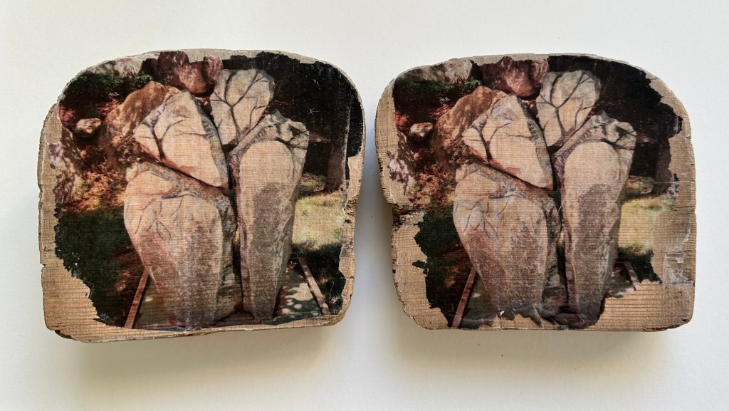 My creative mojo was unearthed and I was chomping at the bit to get a book done as quickly as possible when I returned from the retreat.It took longer than I wanted, ironically trying to find a bit to take on that hunk of wood, but it finally got done. The drift wood is from the shores of Malcolm Island, B.C. Inside the covers are image transfers of a rock statue near the ski museum in Vail, Colorado.