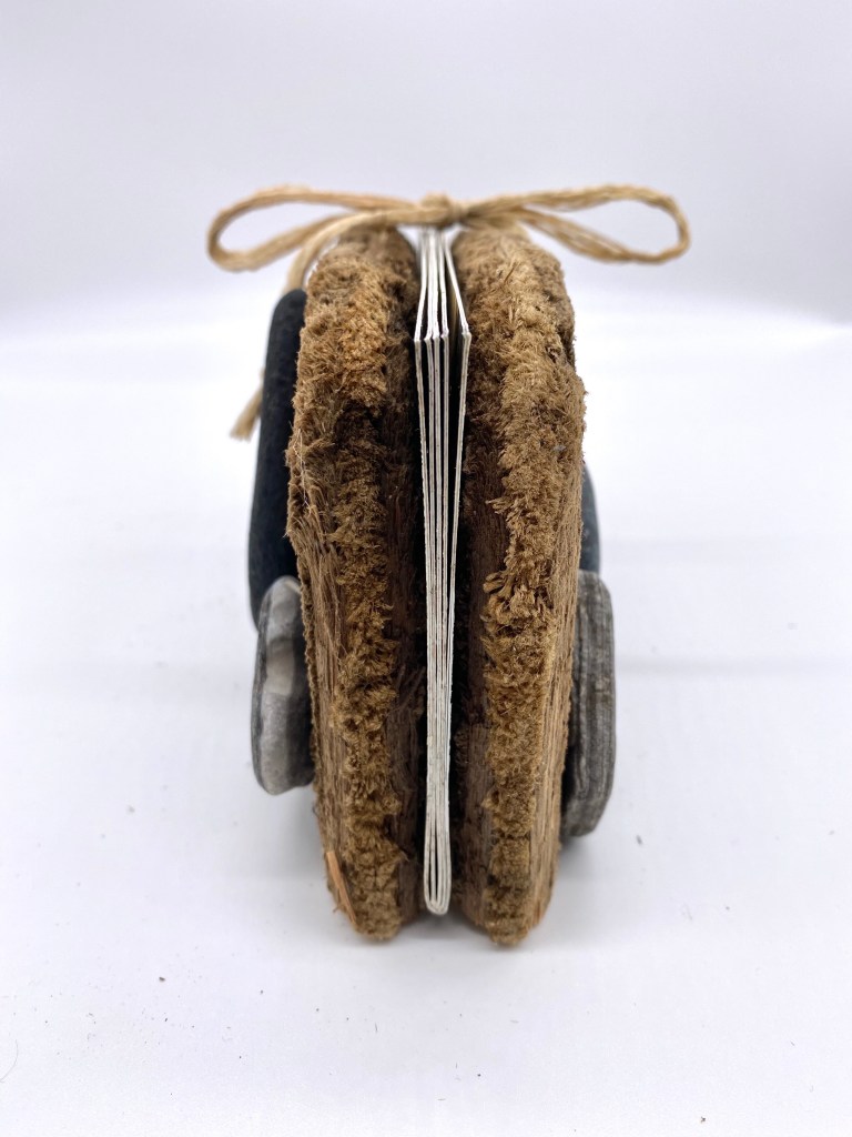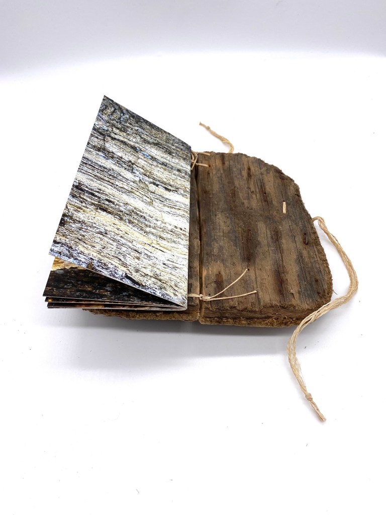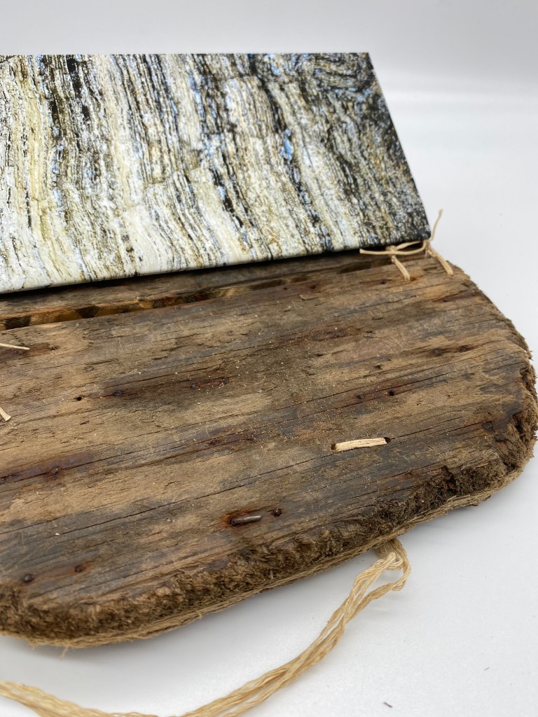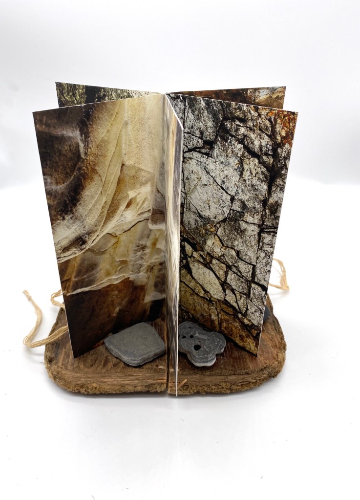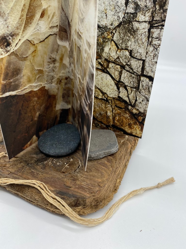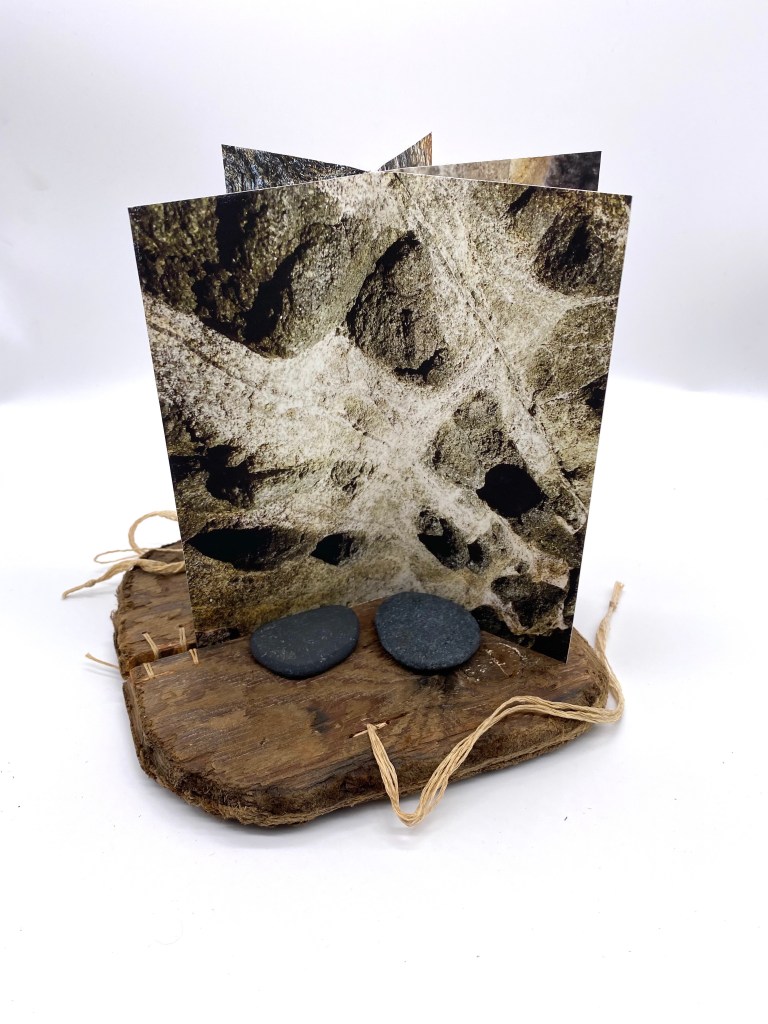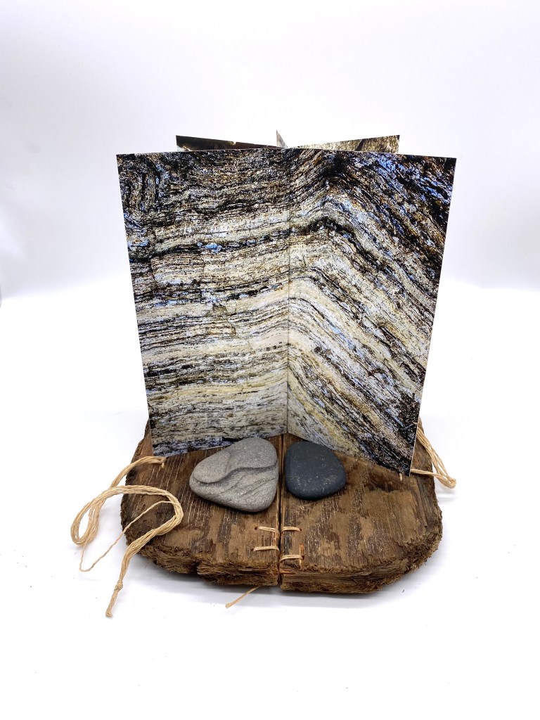 Playing around with geological patter prints from Kathy Gerber I came up with a way to store and display this book. There are so many interesting angles to this as you can tell by the number of photos I took. I am glad for the photos because I did leave this piece with Kathy. It is truly one of a kind. Covers and stones are driftwood from California shores.