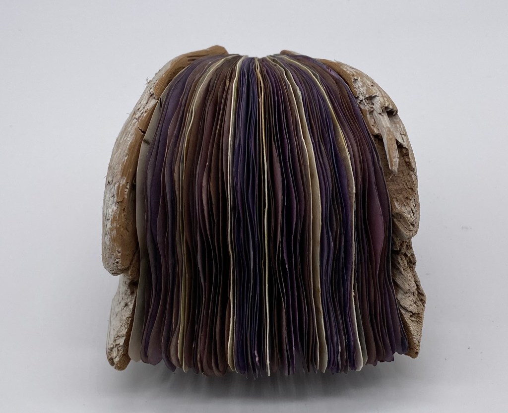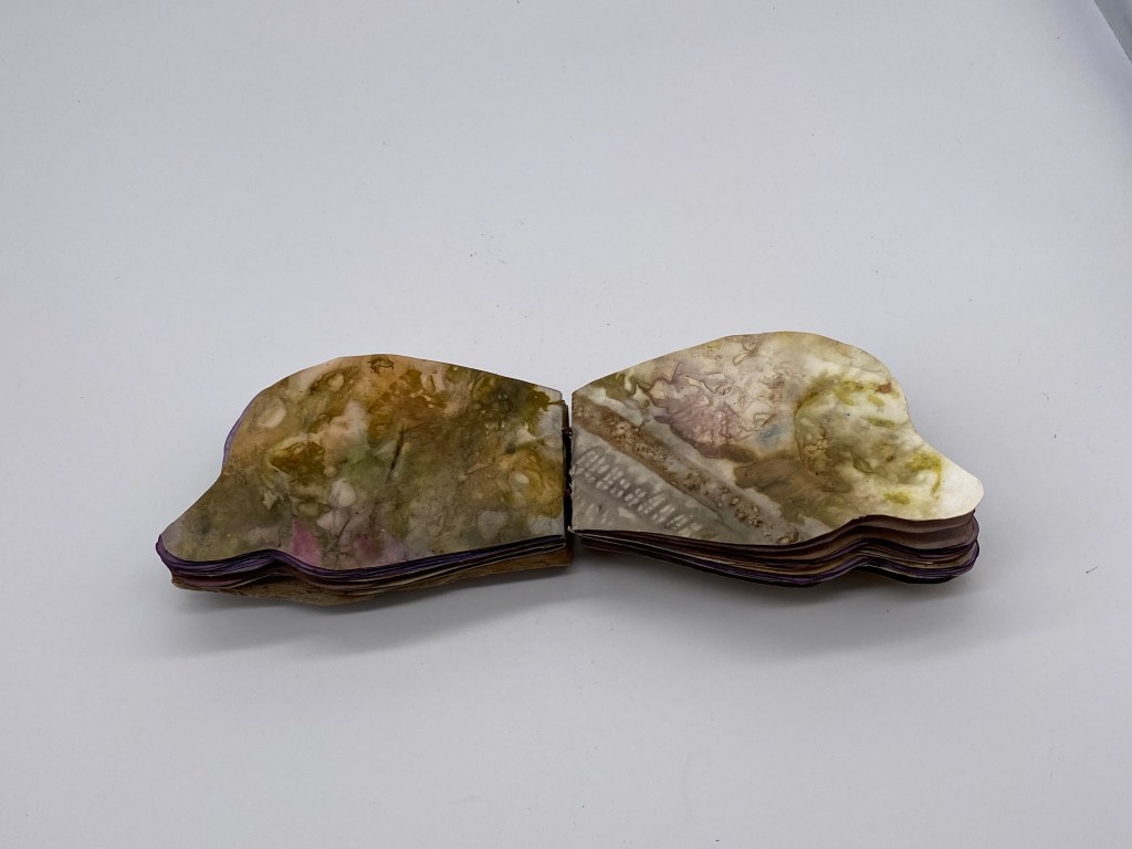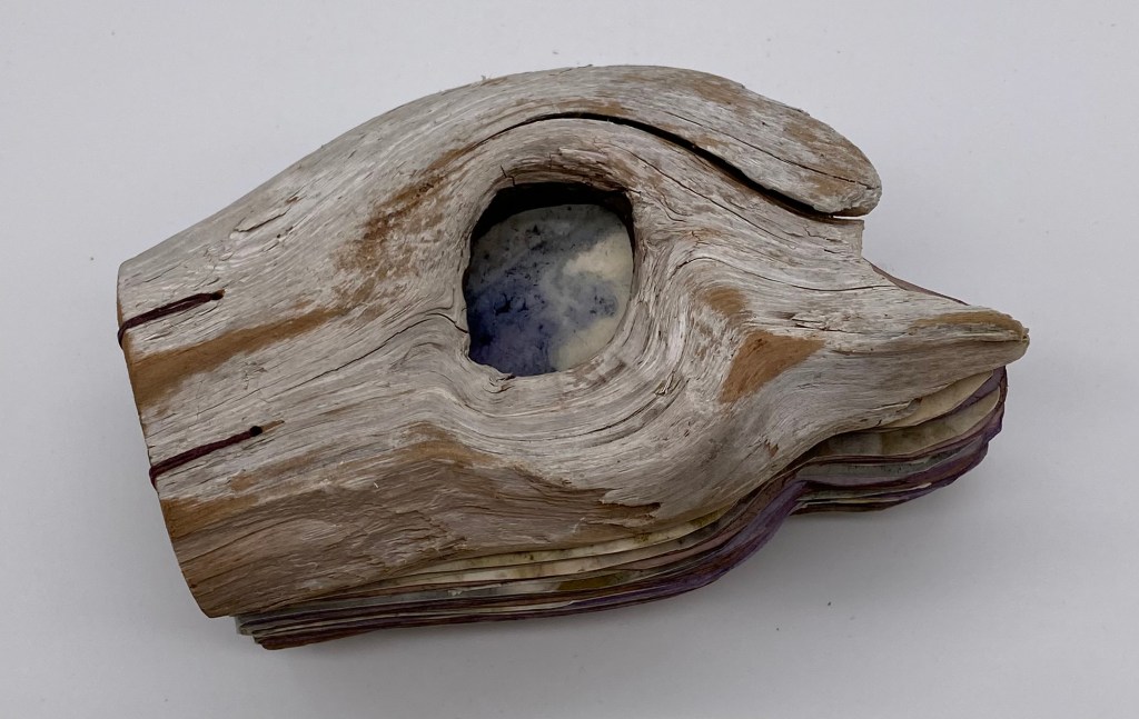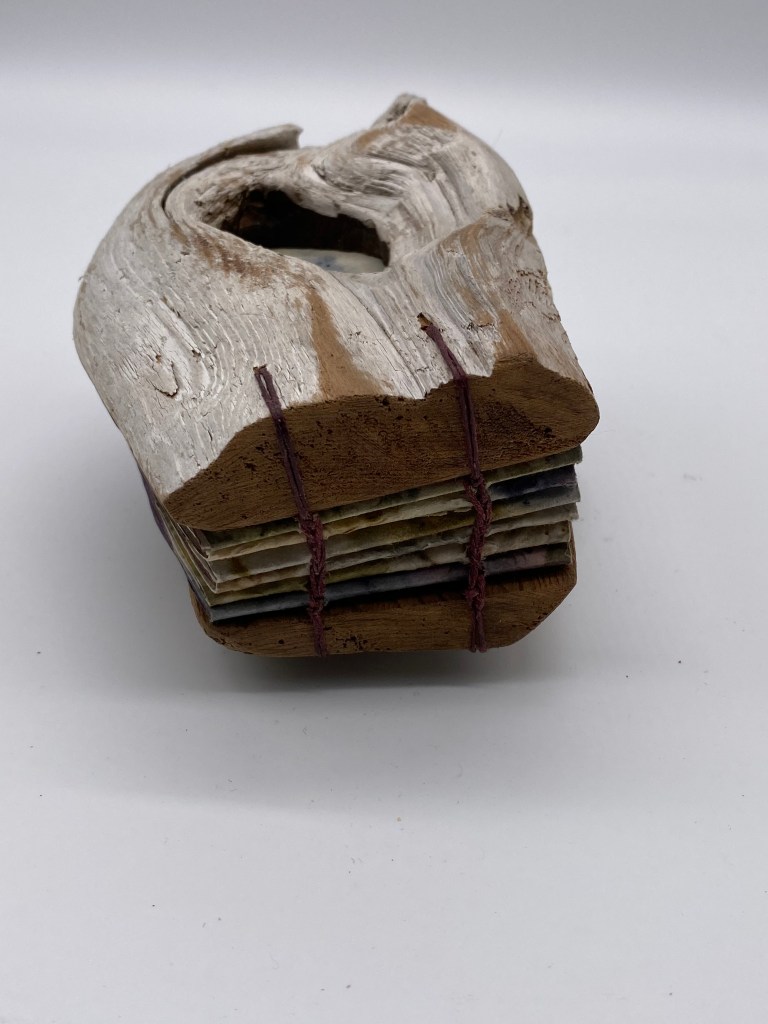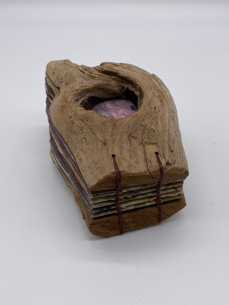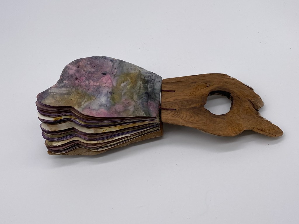 This was my first driftwood book. Made during a magical trip to Sointula, BC for a book binding retreat. This book shifted perspectives literally and figuratively on how I approach art and making. The signature covers are eco dyed with local vegetation, and the pages are also died in local vegetation baths.The covers are from a piece of driftwood I found on the shores of Malcolm Island, BC.