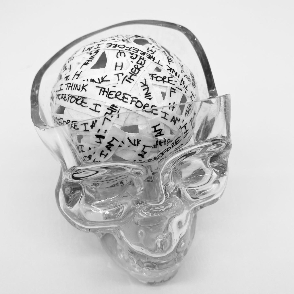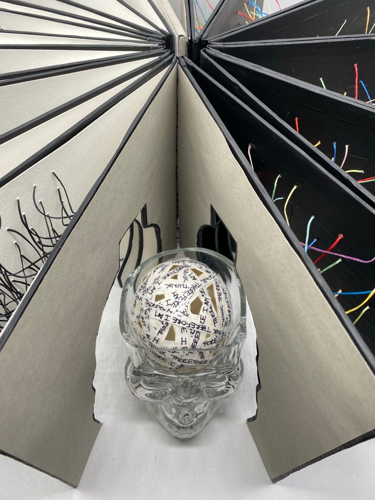 The “book” in its “book case.” Or is it pages inside a glass book cover? No, this is not the only bottle I cut. Yes, bookmakers were injured in the making of this book. (Only once and only a little.) The “brain/book/pages” is paper mache strips of Descartes’ famous “I think therefore I am”. A classic confirmation of being human right where it should be…right where we think…I think.
