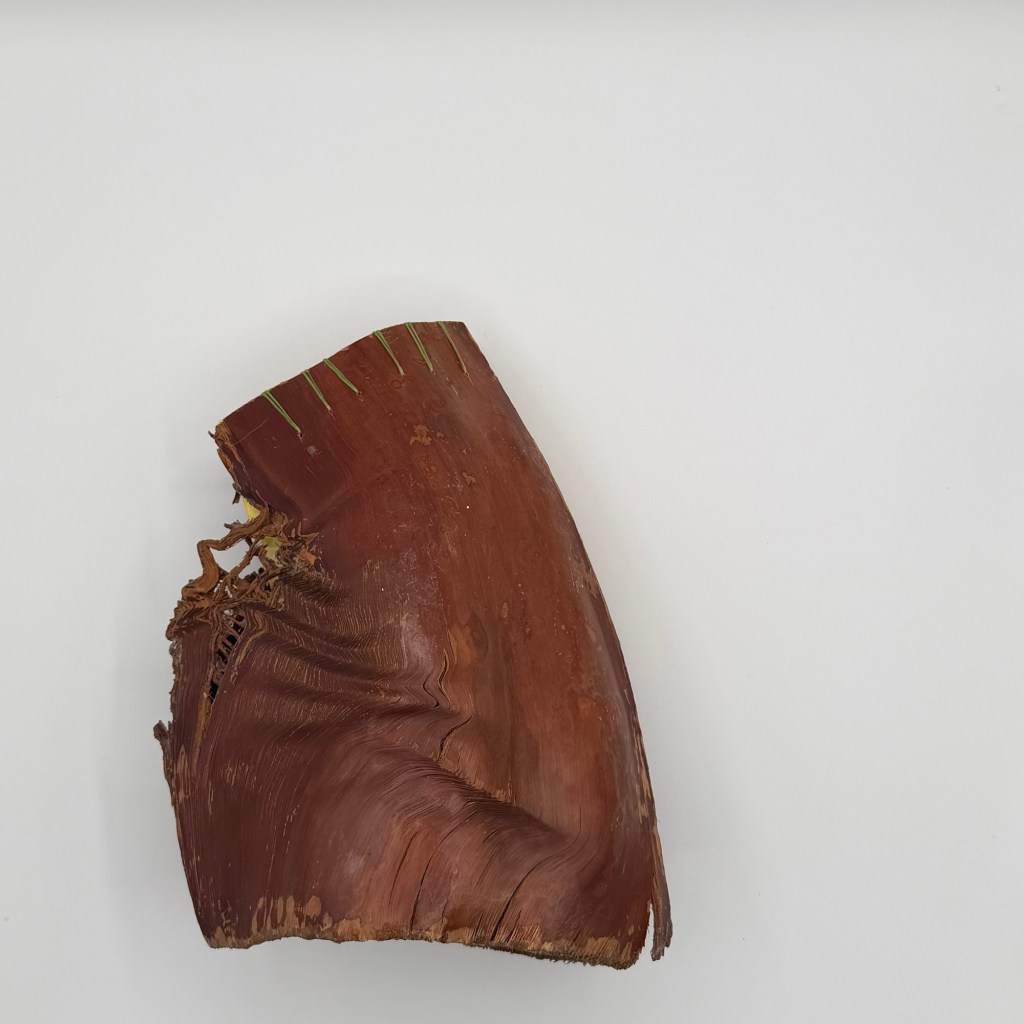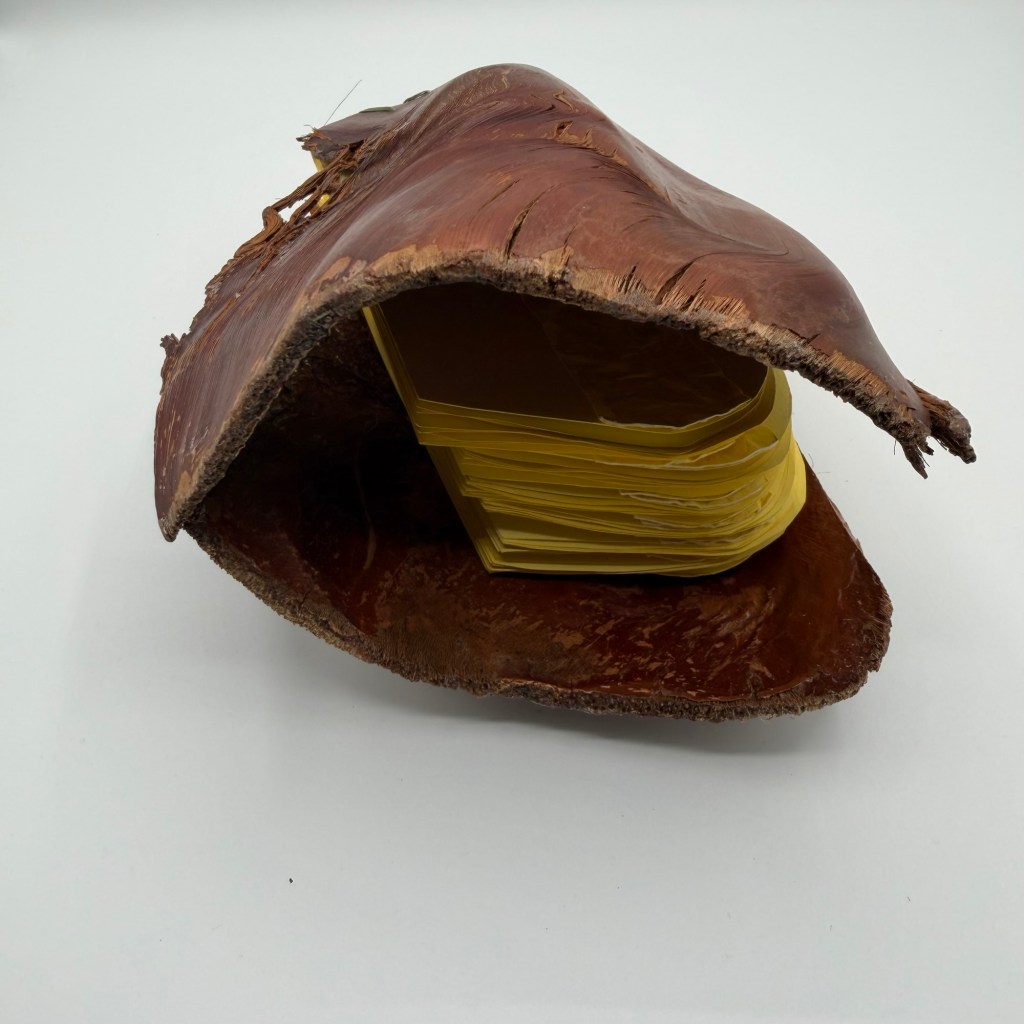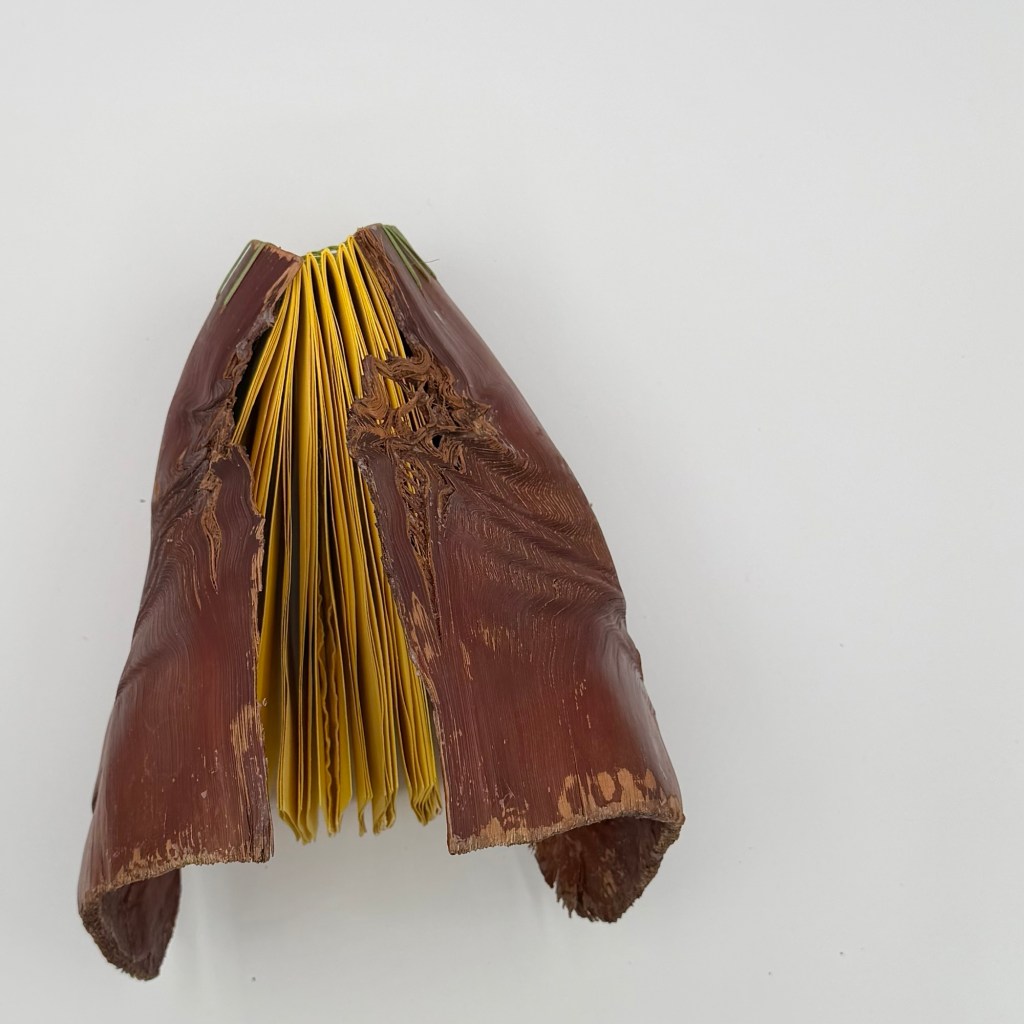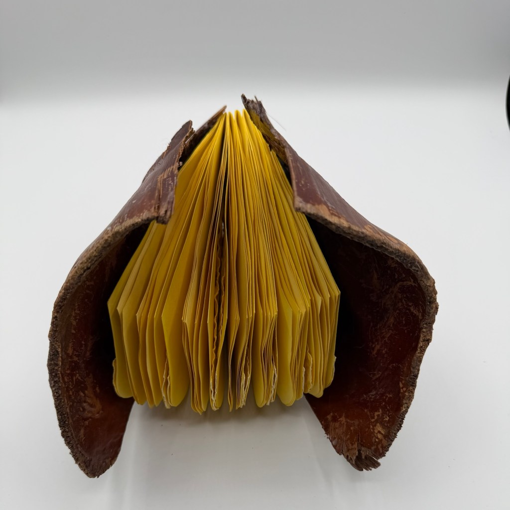 A redo. These palm petioles or leaf sheath covers were found in a beach town on the west coast. I had originally made an accordion book with them a few years back, but was never happy with the final result. This time I Coptic bound these covers with six signatures dyed a beautiful yellow. And each signature cover has a strip of momagami paper adding texture that complements the overall piece. I love the cavern created by covers and the abstract and organic shapes the fibers make.